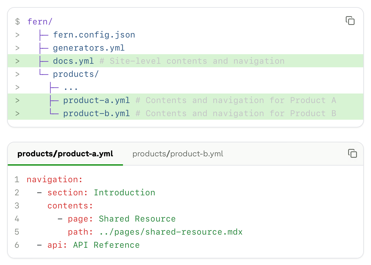 With Fern, you simply create a products folder inside your fern directory. Each product gets its own .yml file that defines its contents and navigational structure, including properties like navigation and tabs if needed.
