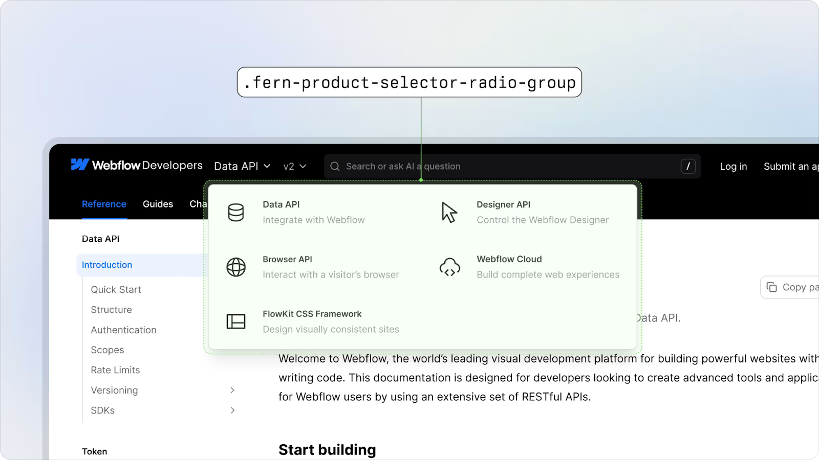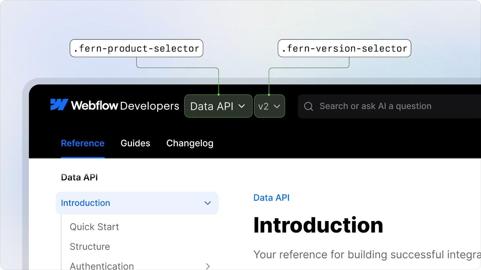 Fern also allowed Webflow to fully customize the look and feel of the product and version selectors in their docs by targeting their CSS classes. This includes:
